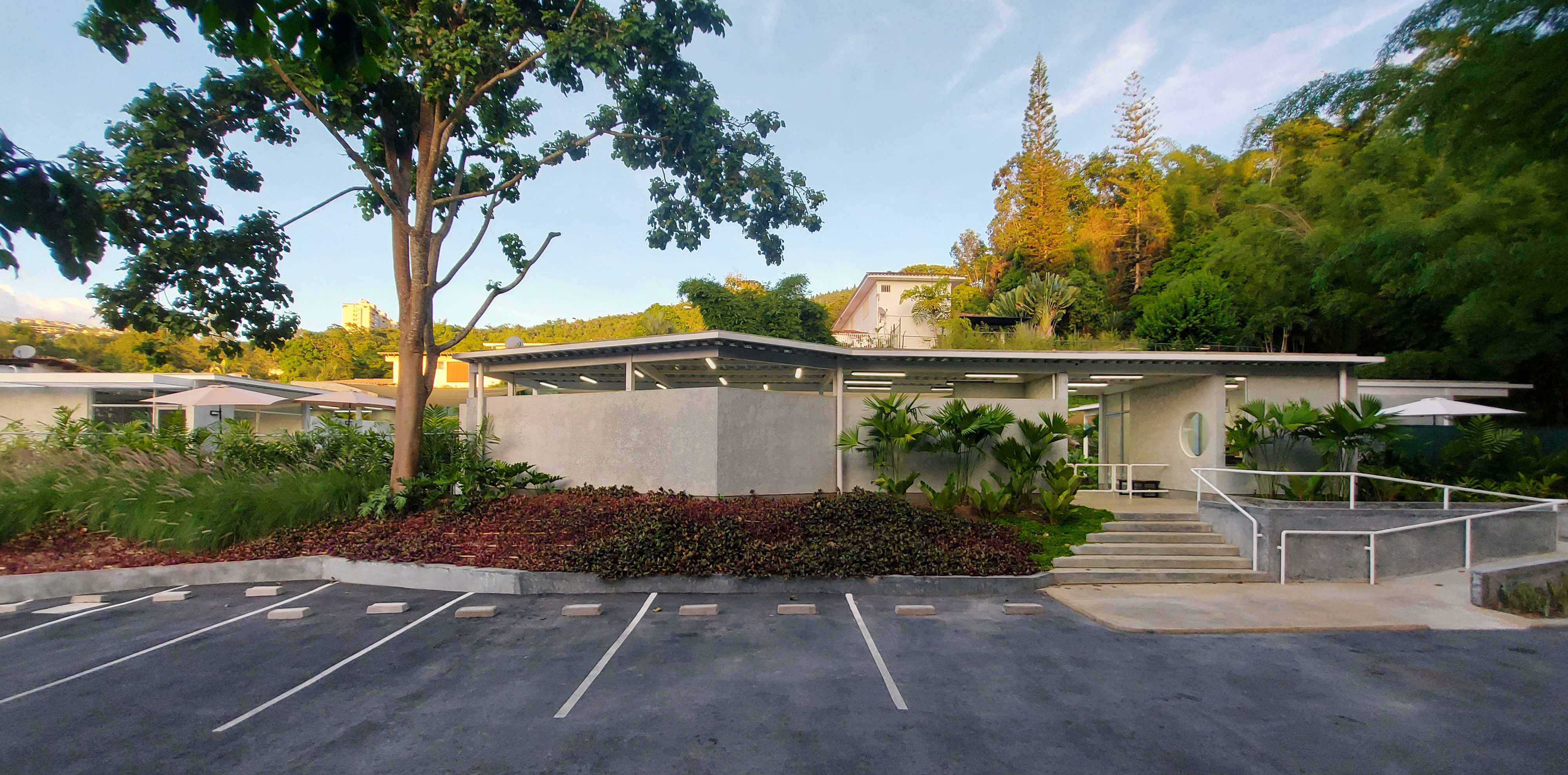 Las edificaciones son de una sola planta, de techos planos y de estructura y cubierta metálica en vista. Los cerramientos se establecen a partir de paredes de mampostería acabadas con frisos rústicos y cerramientos de vidrio con perfiles de aluminio. Los suelos se componen mediante tres grandes manchas definidas por losetas prefabricadas de concreto, decks de PVC y áreas verdes respectivamente.