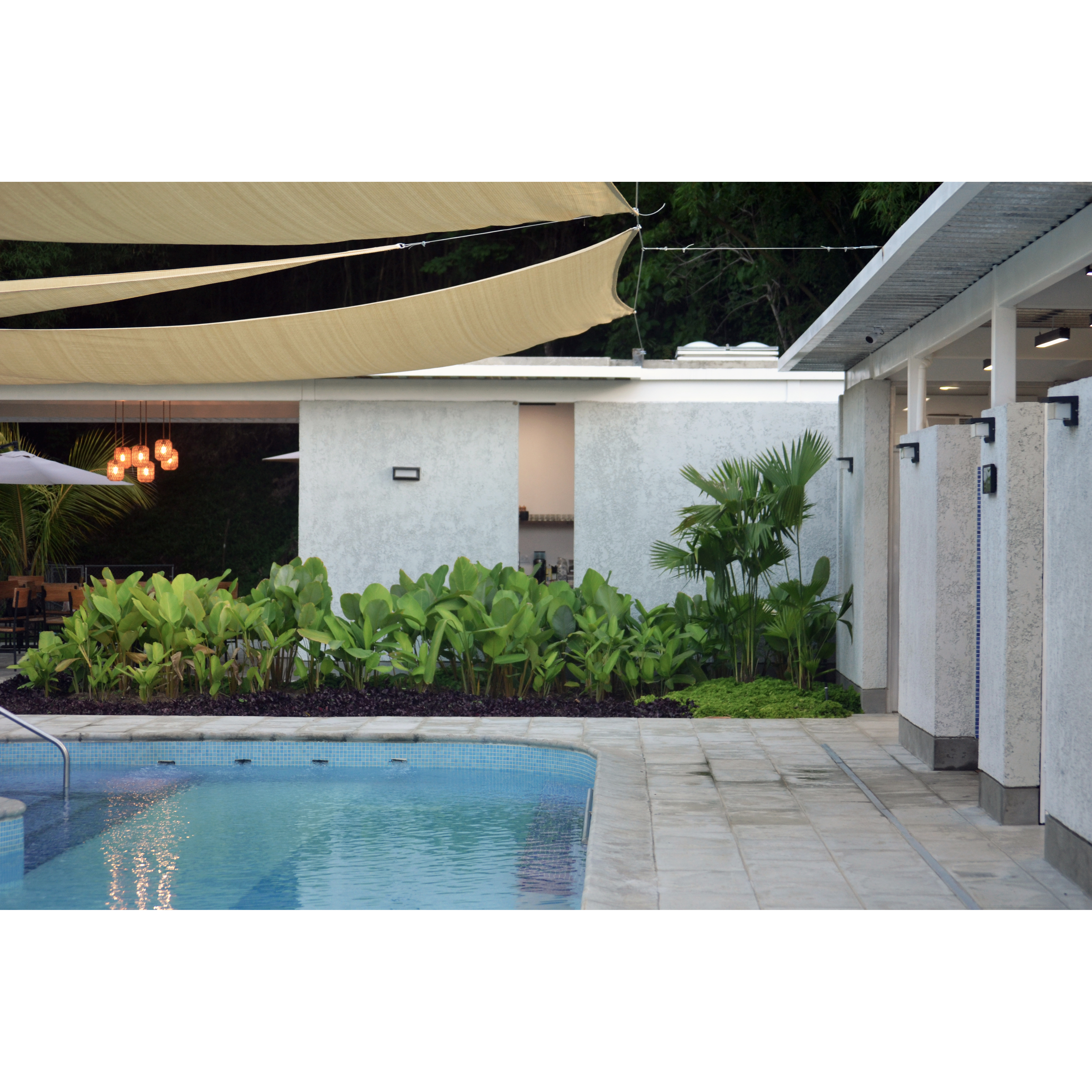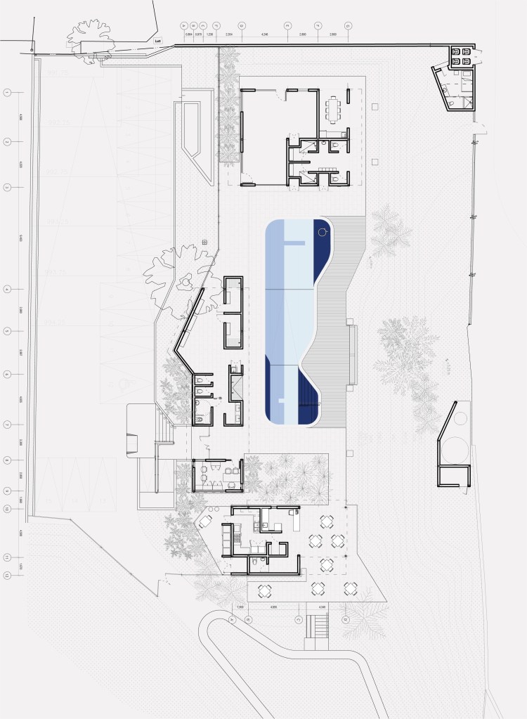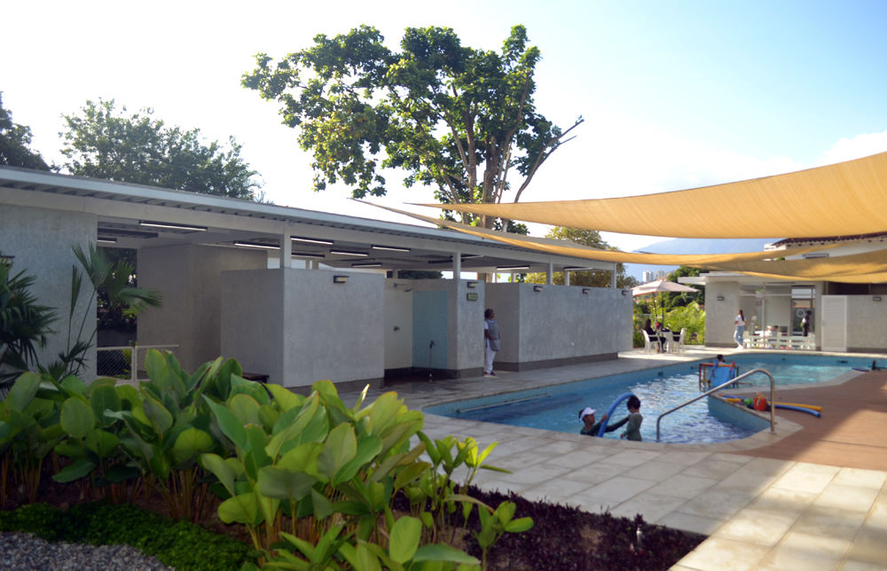 La piscina está delimitada hacia el norte por una edificación que contempla el salón sensorial (dotado de un equipamiento especializado para las actividades que se desarrollan en este espacio), área de cambiadores, baños y salón de profesores. Hacia el este, acompañada de un área generosa de deck, se abre a un talud no intervenido. Al sur se ubica el cafetín y área de mesas. Al oeste un edificio alargado dispone el área principal de cambiadores y baños para niños, y área administrativa, ambos espacios separados por el acceso principal.