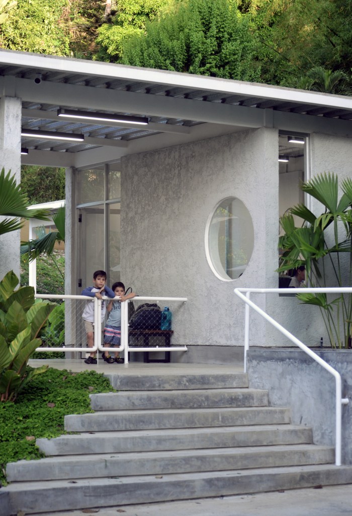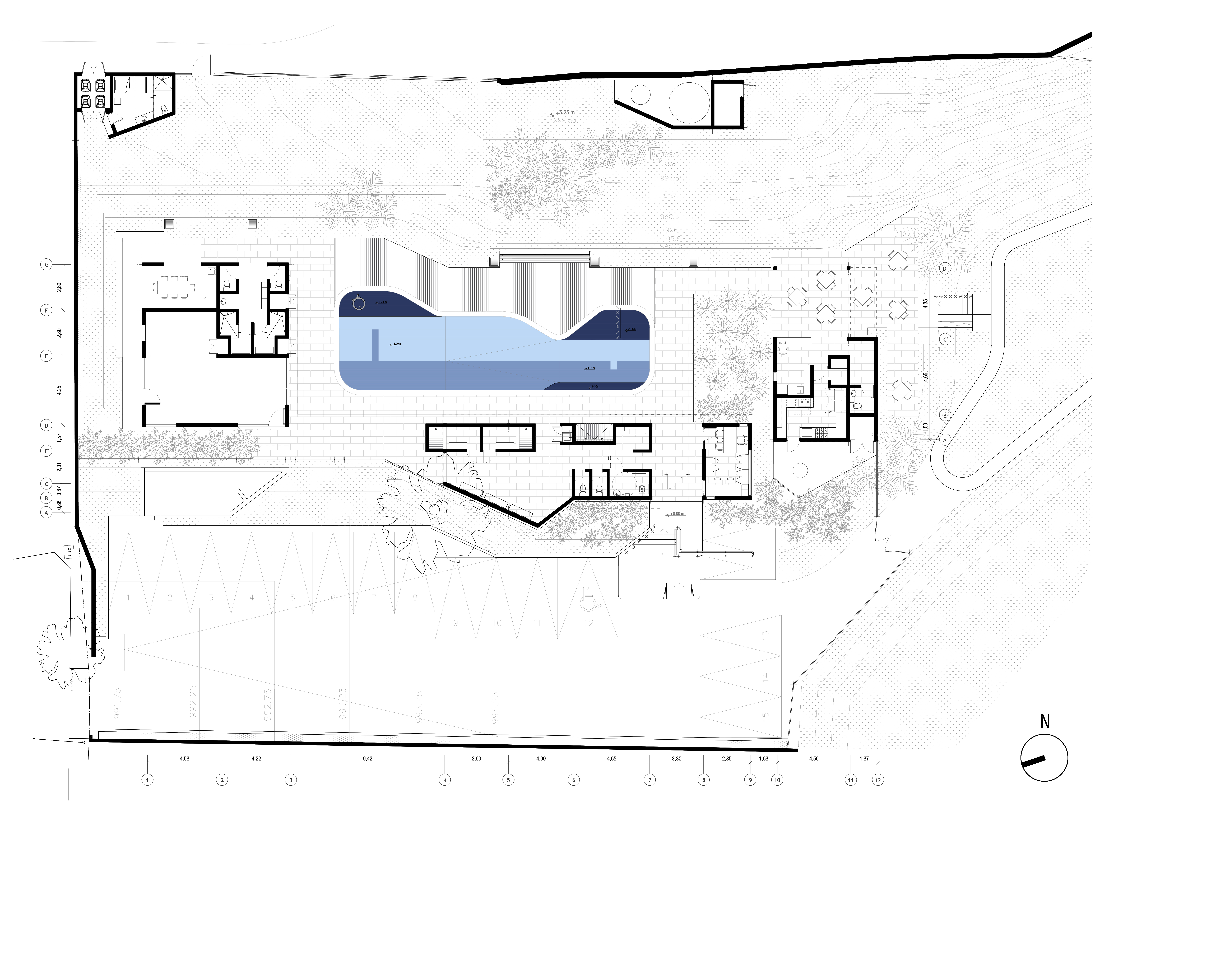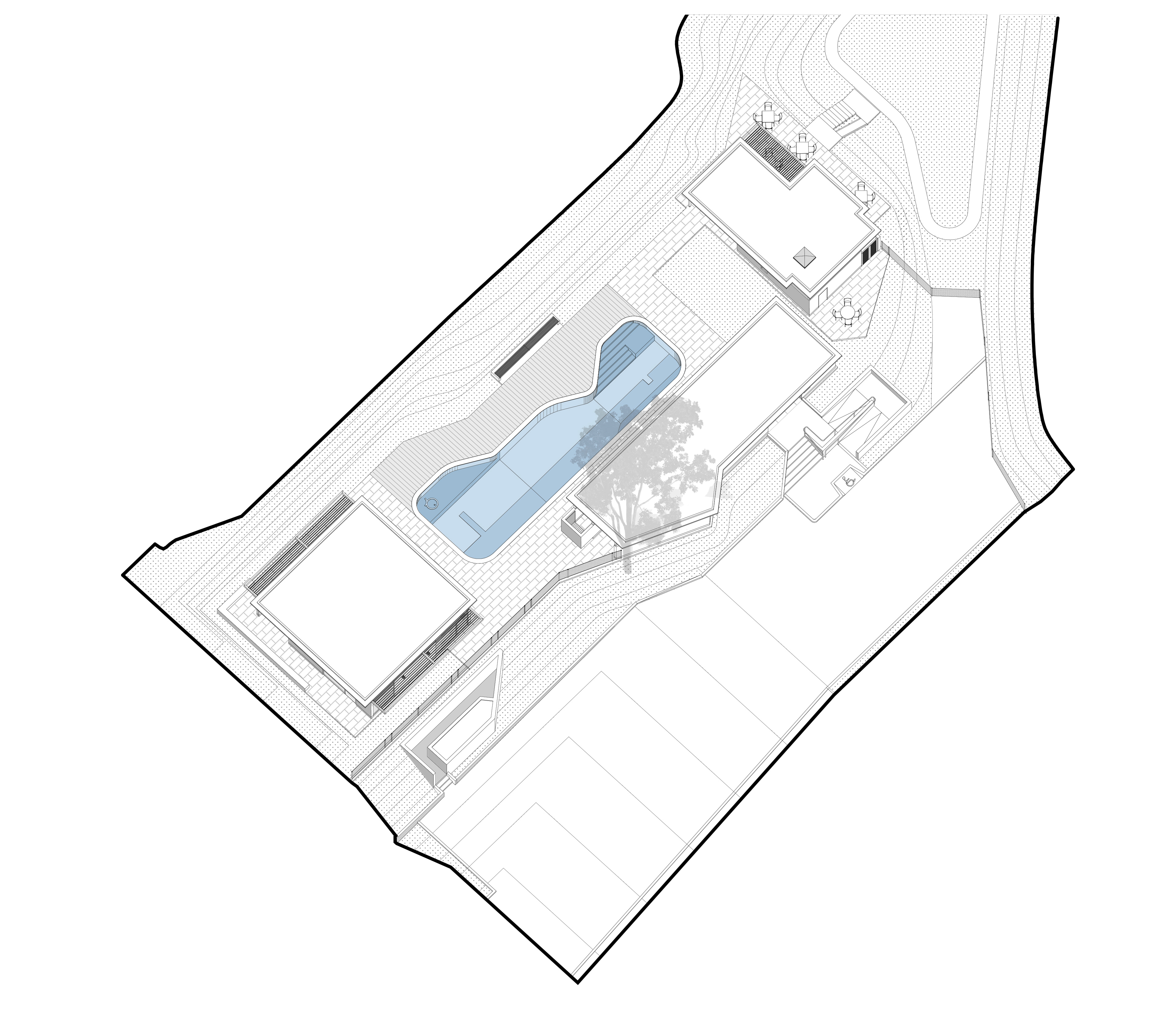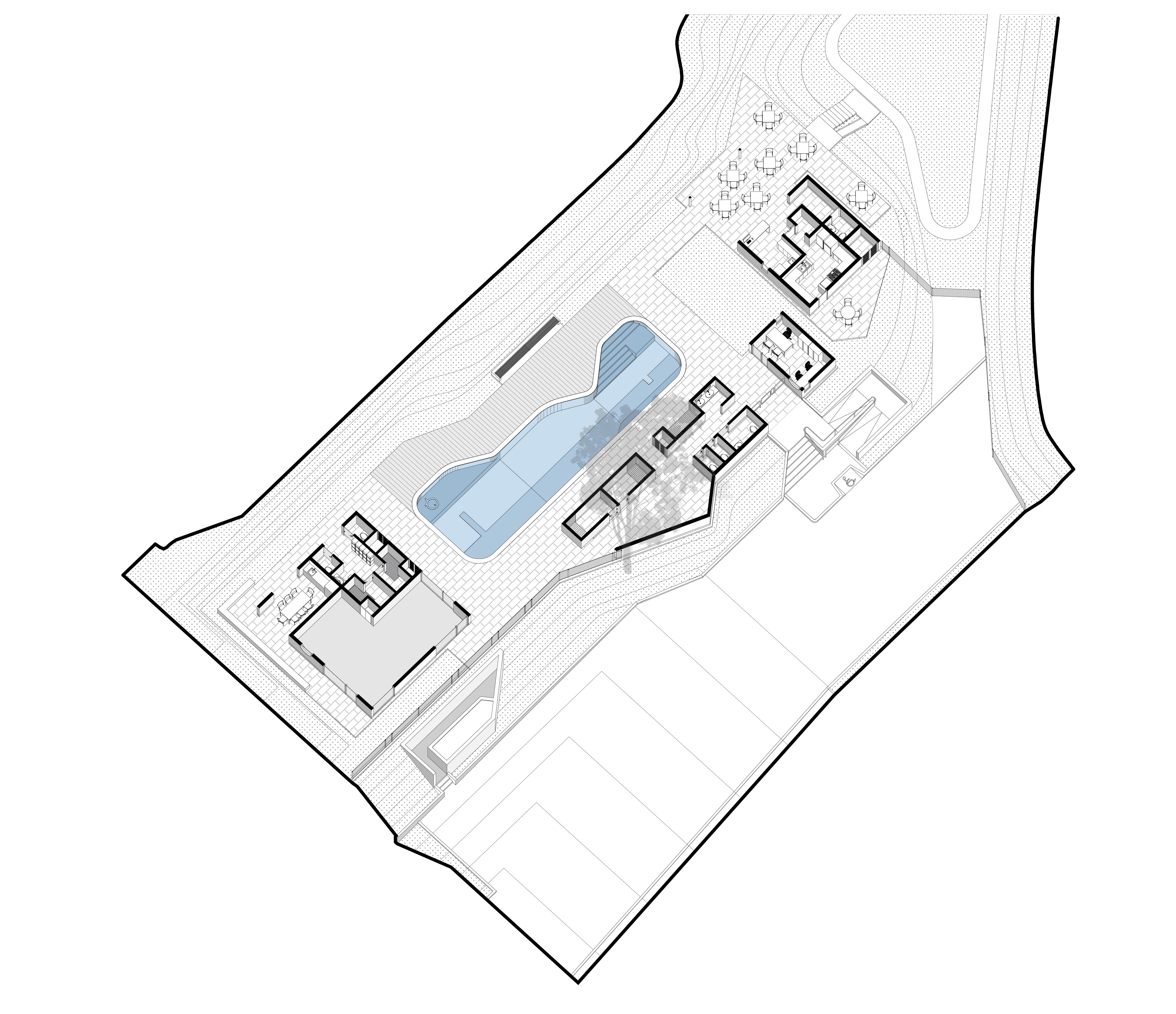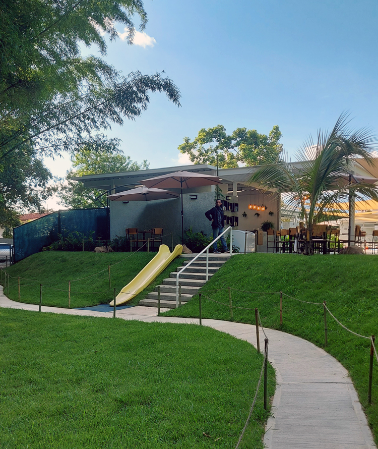Al extremo sur del terreno un área verde de dimensiones similares a la ocupada por la piscina conduce, a través de un trayecto sinuoso, a una caída natural de agua. Estos espacios abiertos, fuertemente vinculados a la naturaleza, terminan de configurar las diferentes zonas de juego y sensaciones que contempla este desarrollo educacional.
