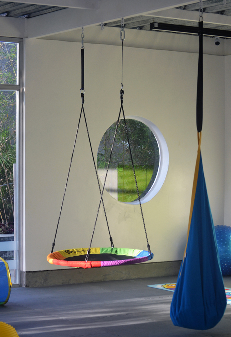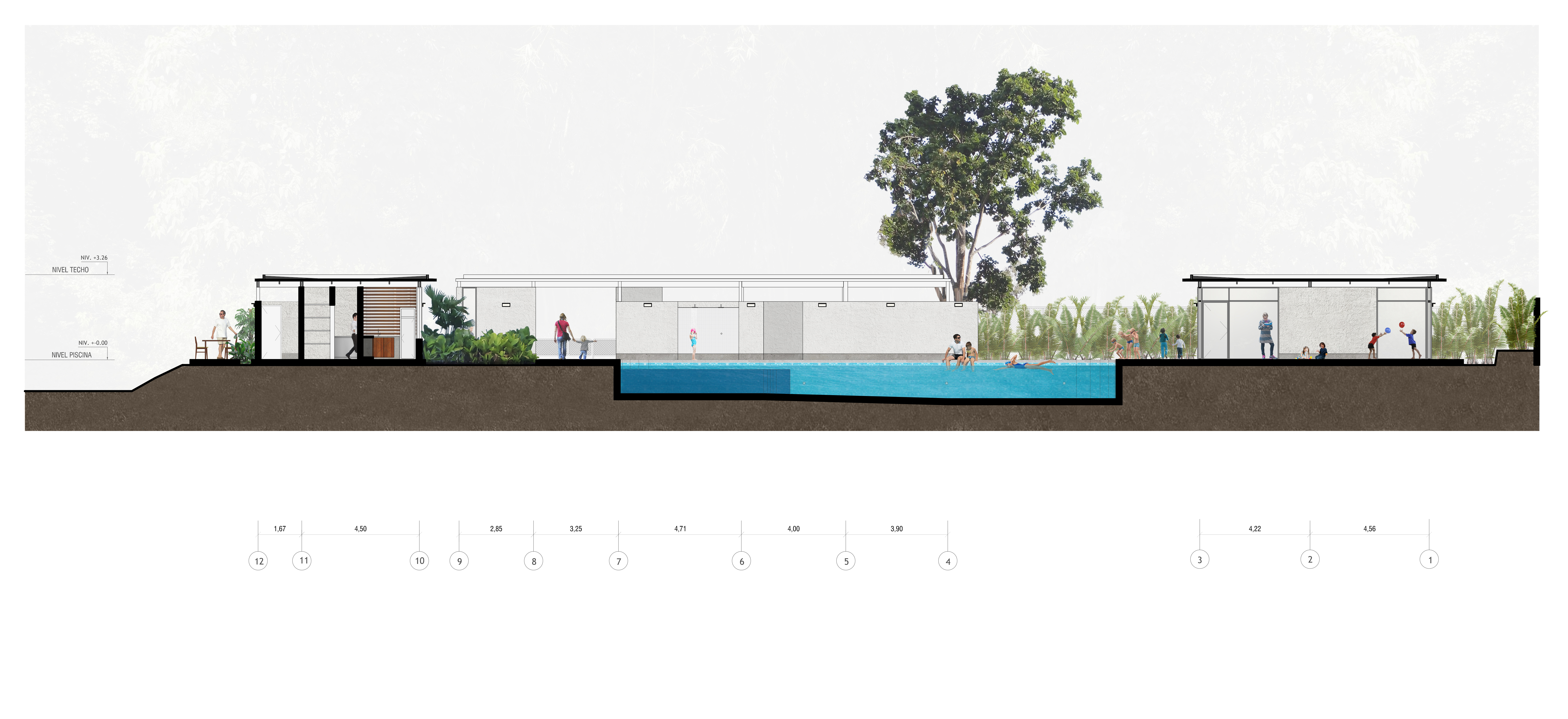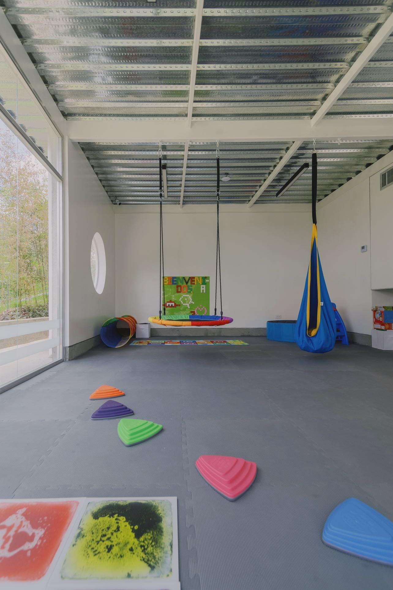 La piscina está delimitada hacia el norte por una edificación que contempla el salón sensorial (dotado de un equipamiento especializado para las actividades que se desarrollan en este espacio), un área de cambiadores, baños y salón para profesores. Hacia el este, acompañada de un área de deck, se abre a un talud no intervenido. Al sur se ubica el cafetín y área de mesas, y al oeste un edificio alargado dispone el área principal de cambiadores y baños para niños, además del área administrativa, ambos espacios separados por el acceso principal.
