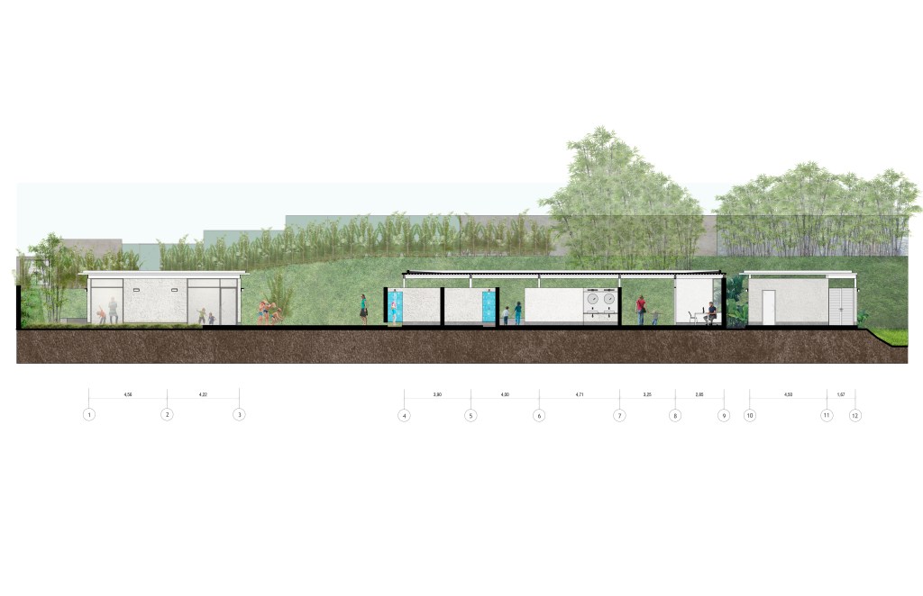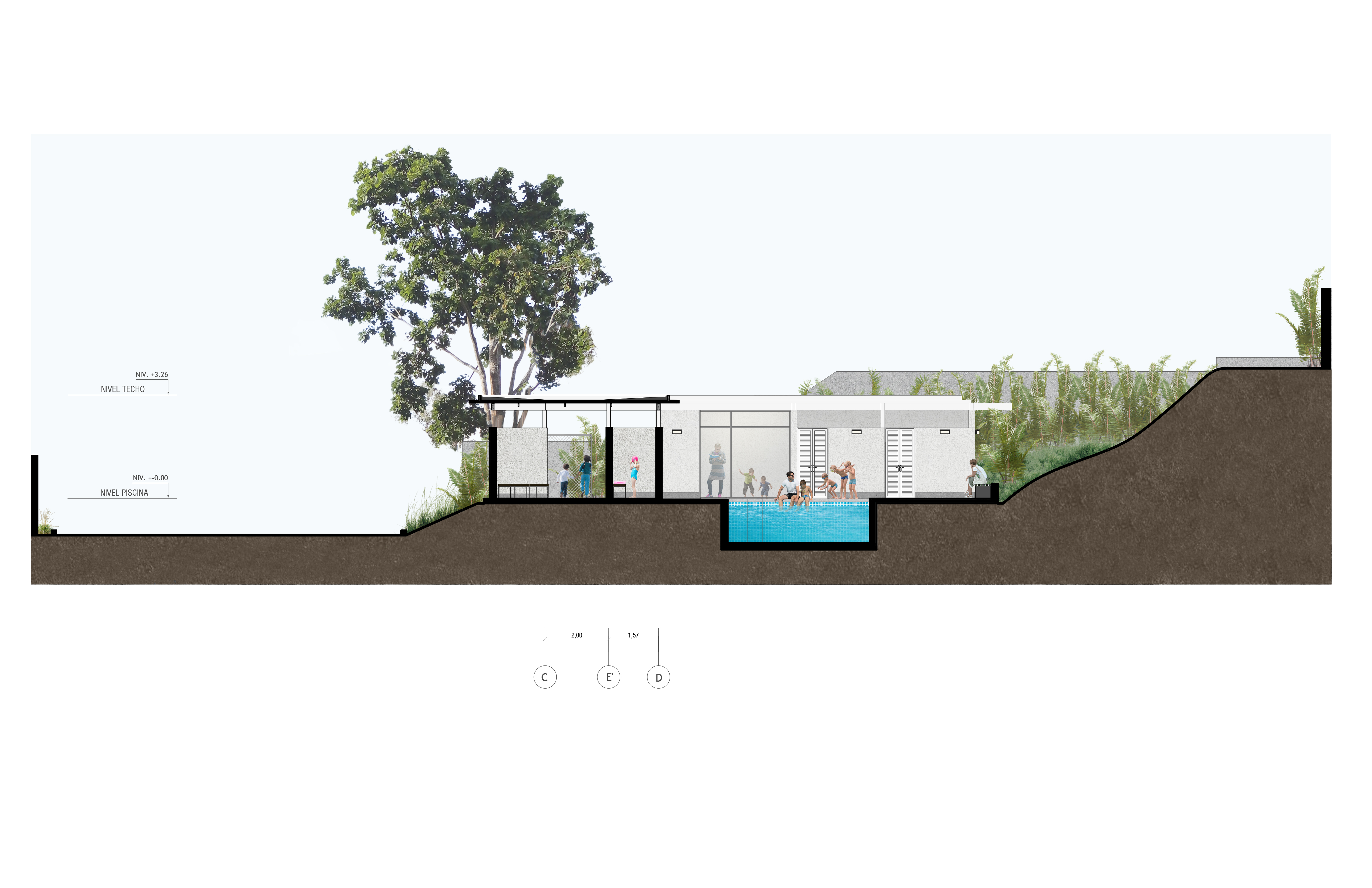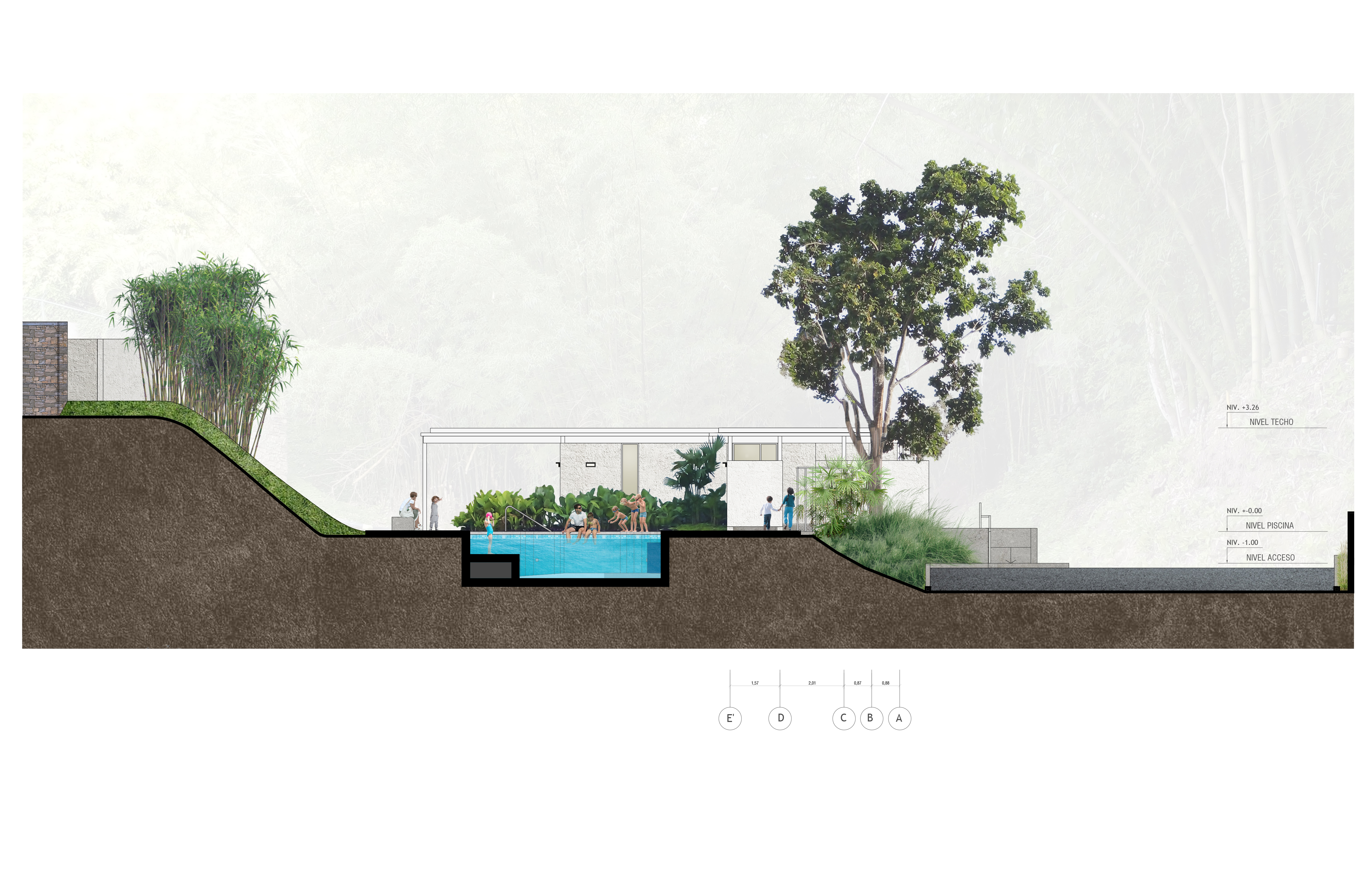 La piscina está delimitada hacia el norte por una edificación que contempla el salón sensorial (dotado de un equipamiento especializado para las actividades que se desarrollan en este espacio), un área de cambiadores, baños y salón para profesores. Hacia el este, acompañada de un área de deck, se abre a un talud no intervenido. Al sur se ubica el cafetín y área de mesas, y al oeste un edificio alargado dispone el área principal de cambiadores y baños para niños, además del área administrativa, ambos espacios separados por el acceso principal.